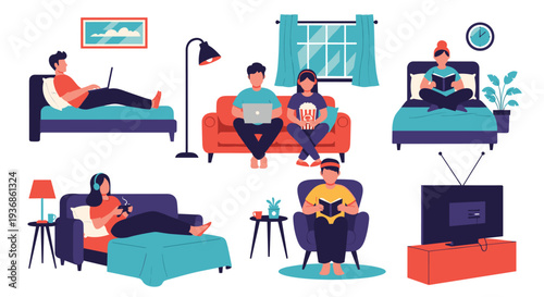 Cleaning company staff cleaner lady, trash collector man with house cleaning equipment, flat vector isolated illustration. Window washing, laundry, ironing, vacuuming, garbage collection, dishwashing.