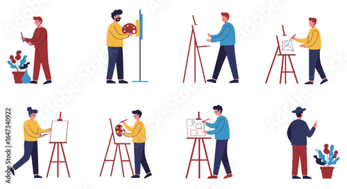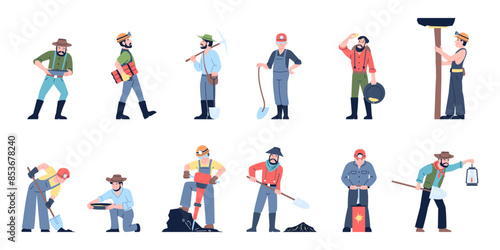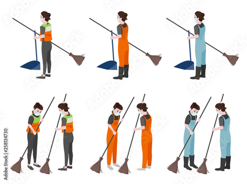 Cleaning company staff, male, female character set, flat vector isolated illustration. Cleaner lady, janitor man with home cleaning equipment. Floor and window washing, dusting, garbage collection.