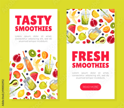 Vertical banner advertising new cleaning products. Bottles with bath, shower, toilet, window and dish cleaner, sample text. Cartoon style vector illustration.