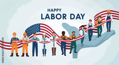 Closed borders to USA for immigration vector. People with luggage bag waiting for opening way to America illustration. Flag under closed with metal chain and lock over cityscape background design