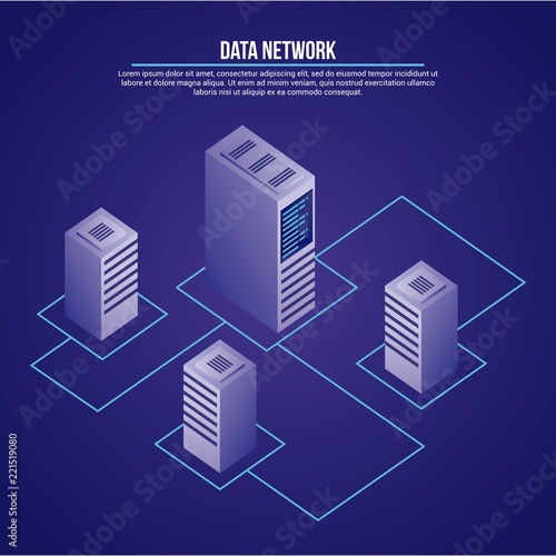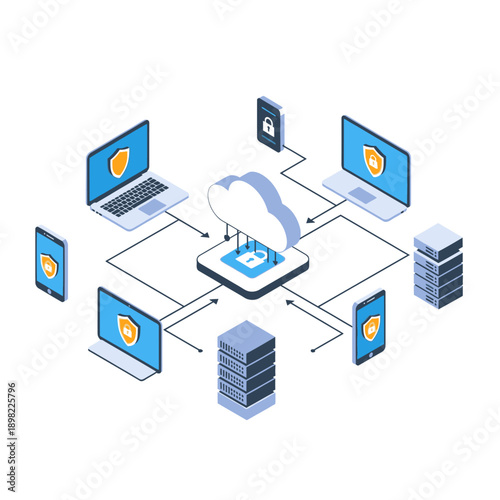 Cloud computing technology flowchart, isometric vector illustration. Cloud data hosting servers, digital folder, laptop, desktop computer, mobile phone.