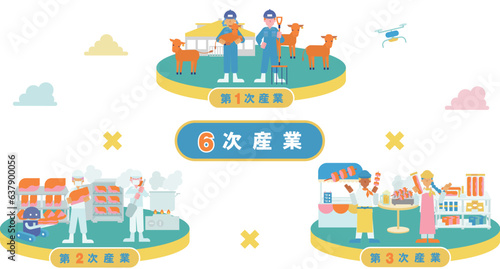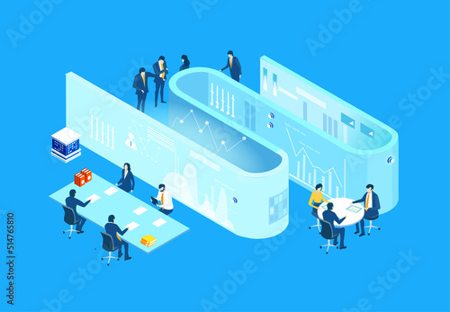 Cloud office concept. Vector isometric illustration of office rooms with personnel on clouds linked by connecting lines.