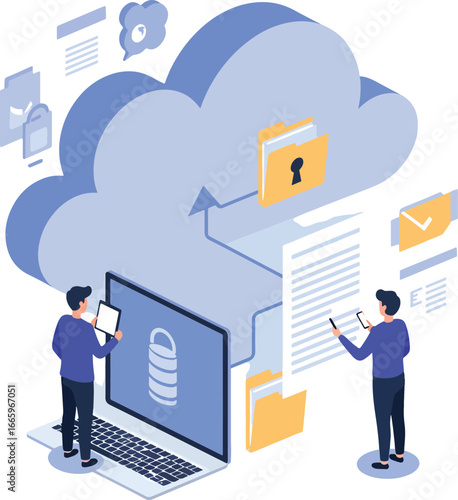 Cloud service access control service vector. Guard man checking user before working with storage server data center isometric 3d design. Protection password code virtual security