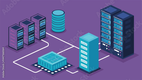 Cloud service flowchart, vector illustration. Isometric laptop computer, mobile phone, server racks. Cloud computing concept.