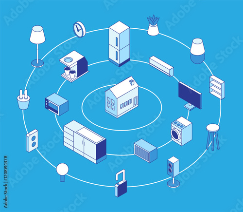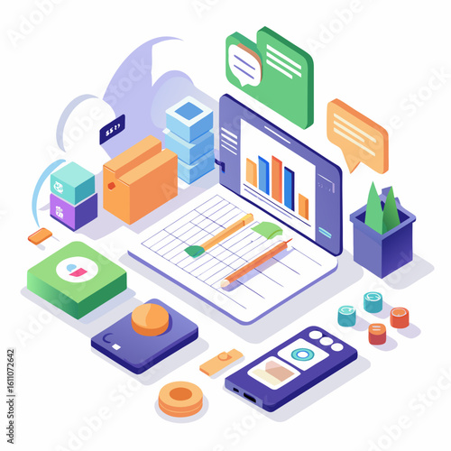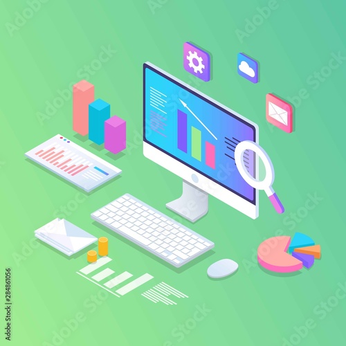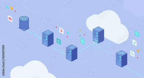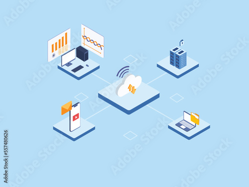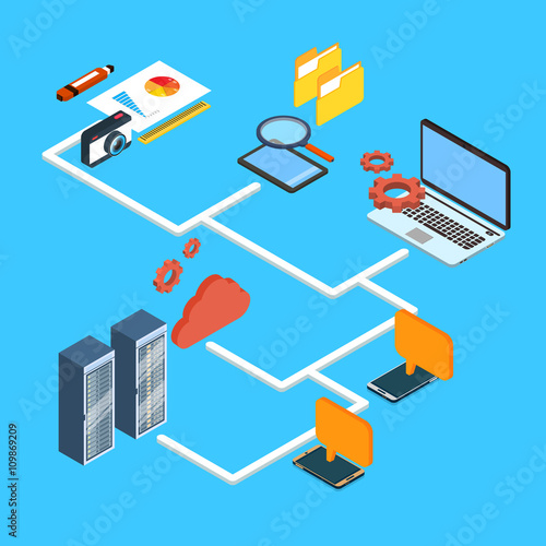 Cloud service flowchart. Vector flat 3d isometric illustration of network servers, internet router, laptop, mobile phone etc.