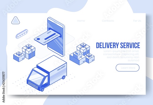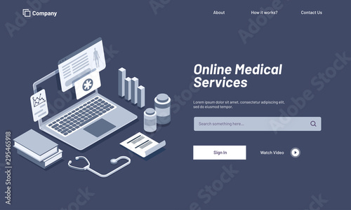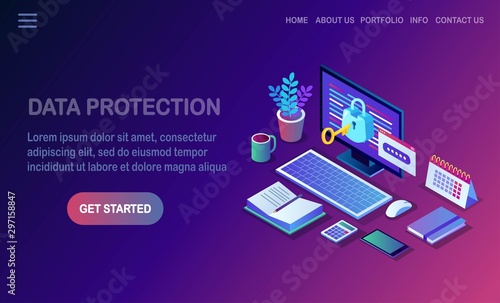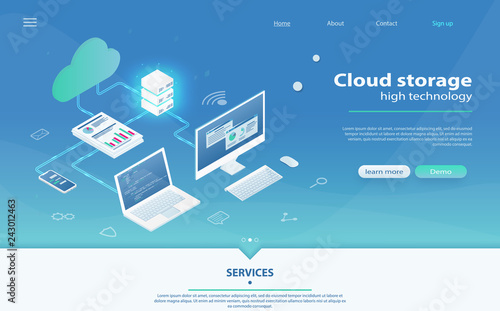 Cloud services landing page website template. Vector isometric illustration. Cloud hosting, network and database concept with desktop pc, laptop, mobile, servers, file folder connected to cloud.