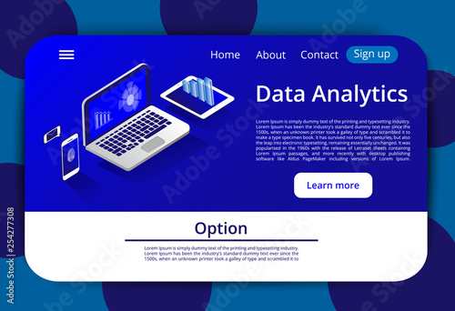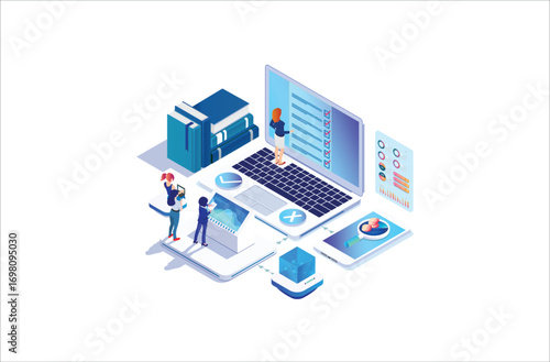 Cloud services landing page website template. Vector isometric illustration. Cloud computing technology concept with desktop pc, laptop, hosting servers, file folder connected to cloud.