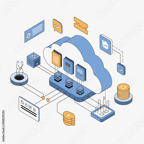 Cloud storage technology flowchart, isometric vector illustration. Computer data storage. Cloud synchronization services.