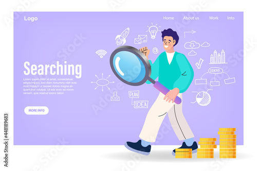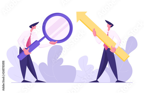 Huge cloud and micro male and female characters with magnifying glass, file folder, laptop computer, vector illustration. Cloud computing technology, the Internet concept for web banner, website page.