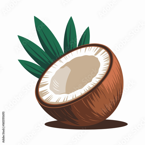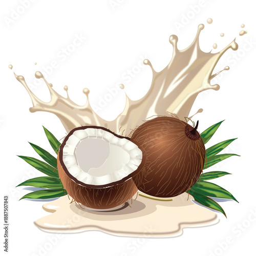 Coconut in chocolate splash over green palm leaves vector icon. Realistic design element for dessert products isolated on white background
