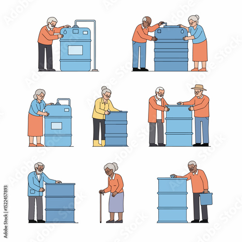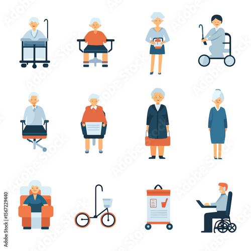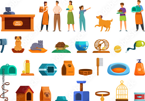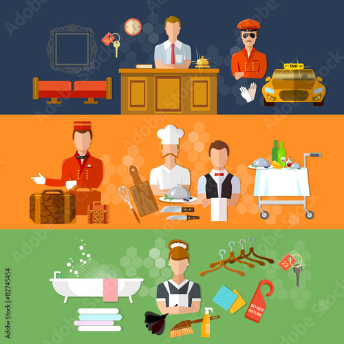 Coffee house vector icon set with workers making coffee, waiter and waitress serving coffee to visitors, confectioner with slice of cake and office people with coffee. Flat style design elements.
