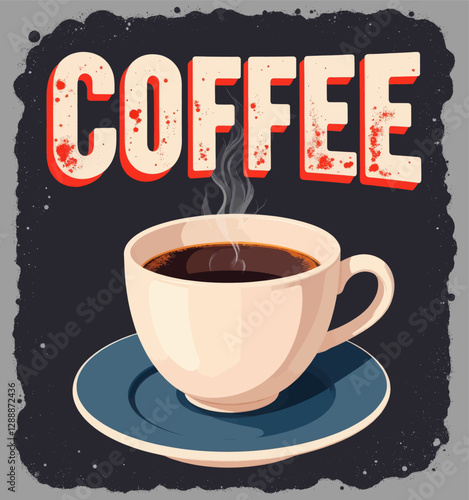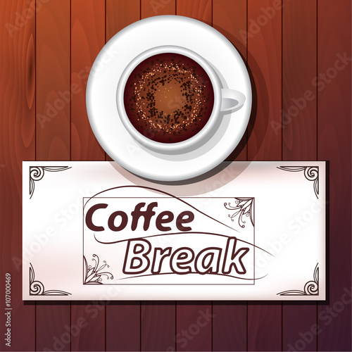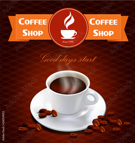 Coffee power concept vector realistic illustration. Top view cup of coffee on wood background. Coffee poster, flyer design template.