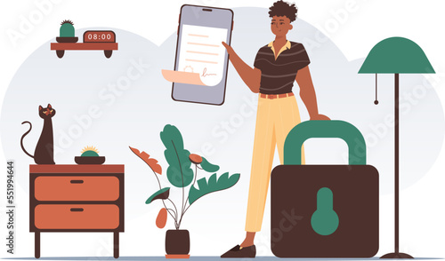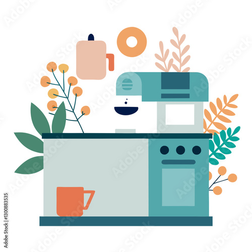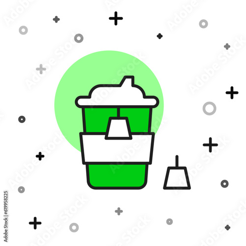Coffee production vector flat illustration. Hand putting lid on glass pitcher, grinder, mug of drink with whipped cream, disposable cup, croissant, candies. Coffee with croissant poster, banner.