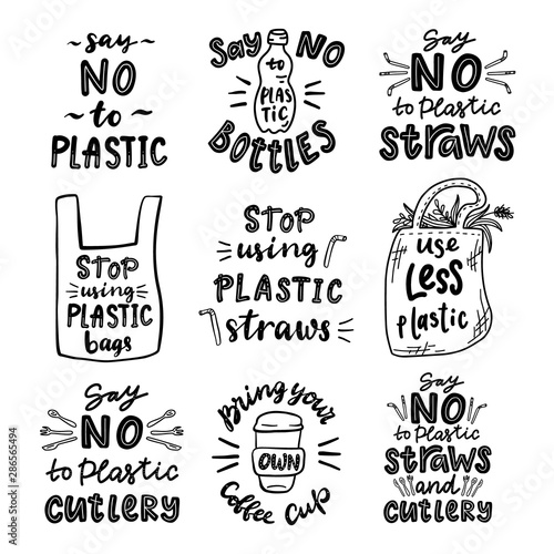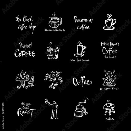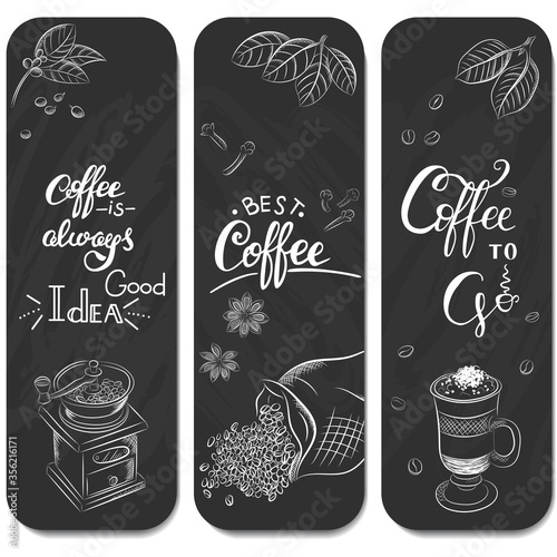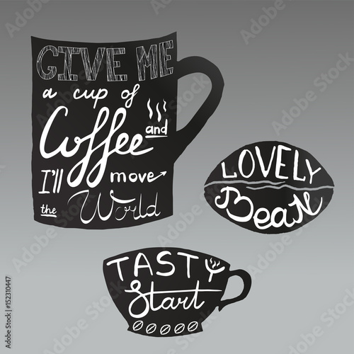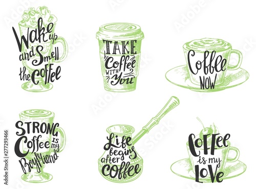 Coffee quotes hand lettering typography, vector illustration. Coffee mugs with motivational morning coffee sayings. Vintage labels, emblems with inspirational phrases on black background.