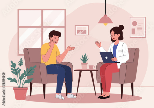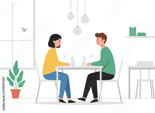 Coffee shop scene. Happy man and woman drinking coffee, talking to each other sitting at bar counter, flat vector illustration. Young people friends meeting. Coffeehouse, cafe interior.