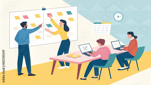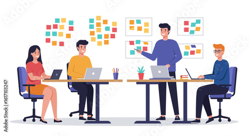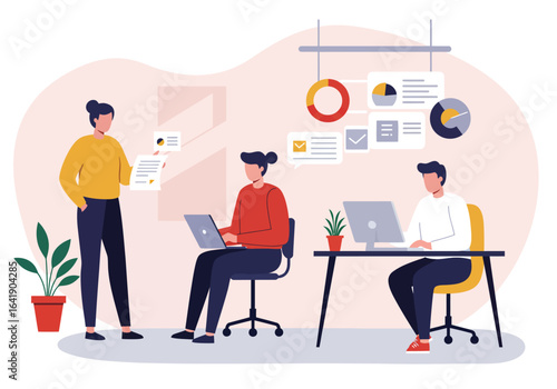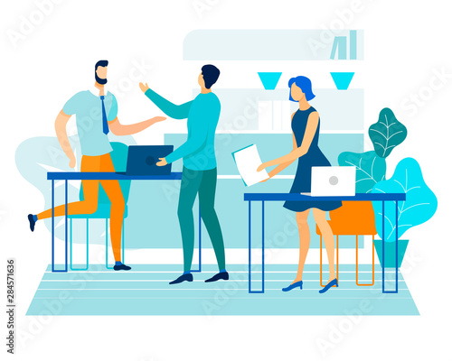Coffee shop scene. People drinking coffee, talking to each other, discussing something, flat vector illustration. Young people friends, colleagues, business team meeting. Coffeehouse, cafe interior.