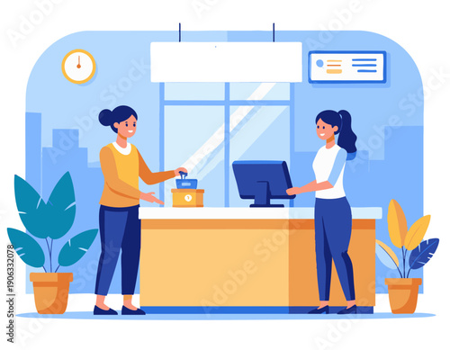 Coffee shop scene. Barista and visitor at bar counter, flat vector illustration. Happy woman buying coffee to go in her reusable cup. Coffeehouse, cafe interior.