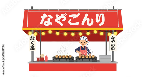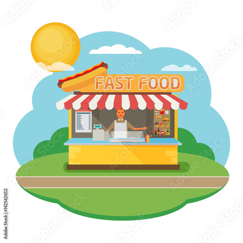 Coffee street market opening. Male vendor cartoon character in uniform making hot aroma drink in cup. Coffeehouse showcase on sidewalk