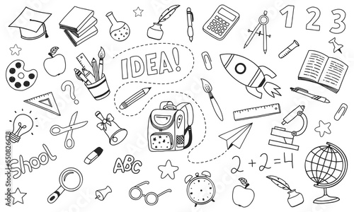 Realistic top view cup of coffee against hand drawn business and finance symbols background, vector illustration. Coffee time poster design template.