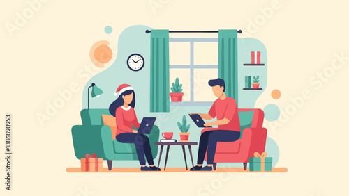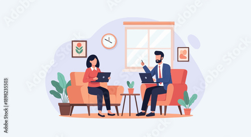 Coffee to go concept vector illustration in flat style. Couple young man and woman sitting on bench, talking to each other and drinking coffee.