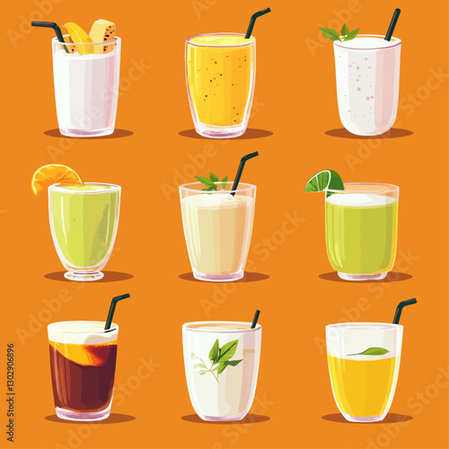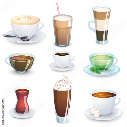Coffee types set, vector isolated illustration. Espresso types, doppio, trippio, cappuccino, frappe, americano, caramel macchiato, other coffee drinks with names for restaurant, cafe menu etc.