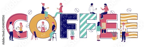 Coffee typography banner template, vector flat illustration. People buying hot beverage from vending machine. Barista making coffee for young man, people drinking coffee while sitting on big letters.