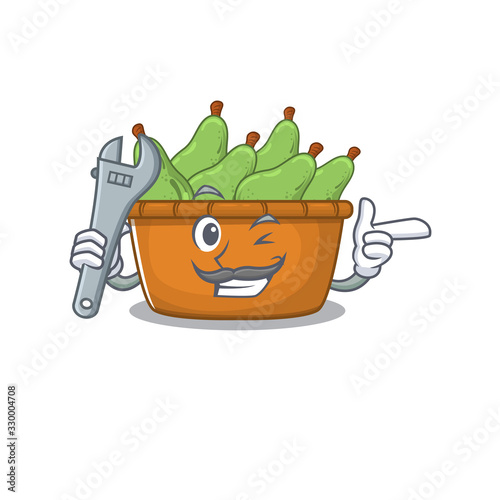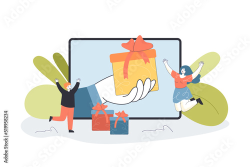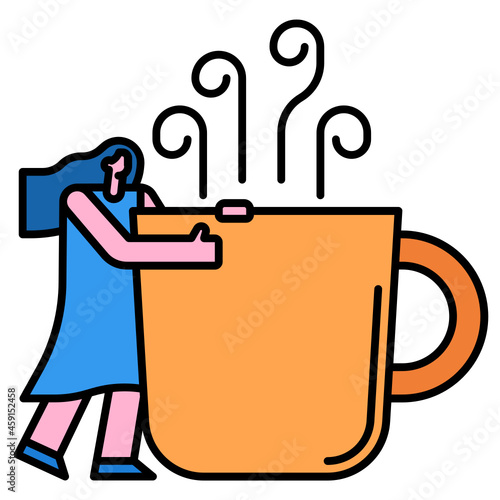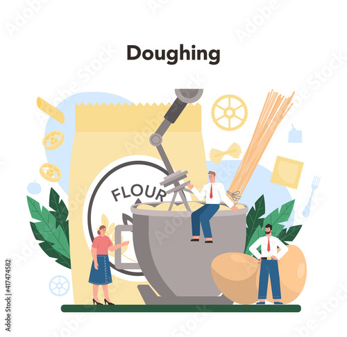 Tiny characters barista team making coffee using big coffee maker, kettle, spoon, vector illustration. Coffee shop, cafe, bar or coffeehouse composition for web banner, website page etc.