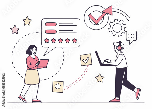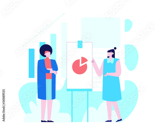 Coffee break concept vector illustration. Huge takeaway coffee cup and micro male and female characters with coffee to go communicating, discussing something etc.