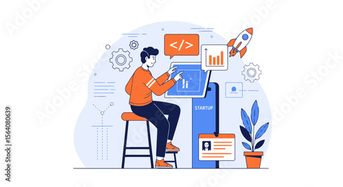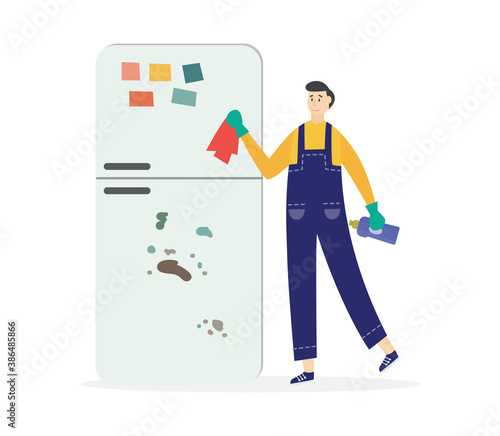 Woman cleaning shopping mall glass showcase with rag and spray cleaner, vector flat illustration isolated on white background. Professional commercial cleaning services.