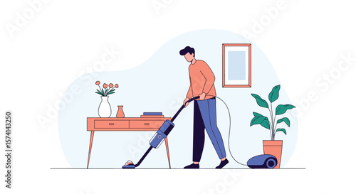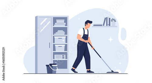 Woman cleaning floor using mop, vector flat illustration isolated on white background. Professional commercial cleaning services, mopping floors.