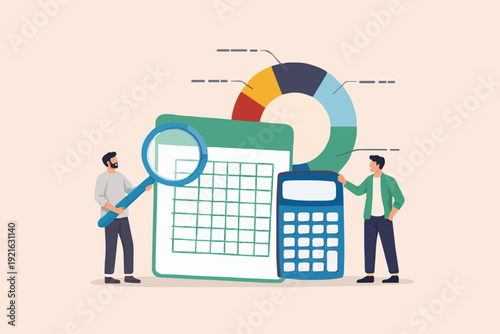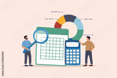 Company budget planning, financial accounting, audit concept vector flat illustration. Clipboard with financial budget plan, calculator, characters analysing diagram with magnifier, sitting on coins.