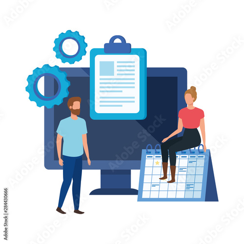 Company budget vector flat style design illustration. Budgeting and business planning process concept with big piggy bank, calculator, tiny people doing financial calculations for web banner, webpage.