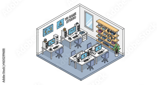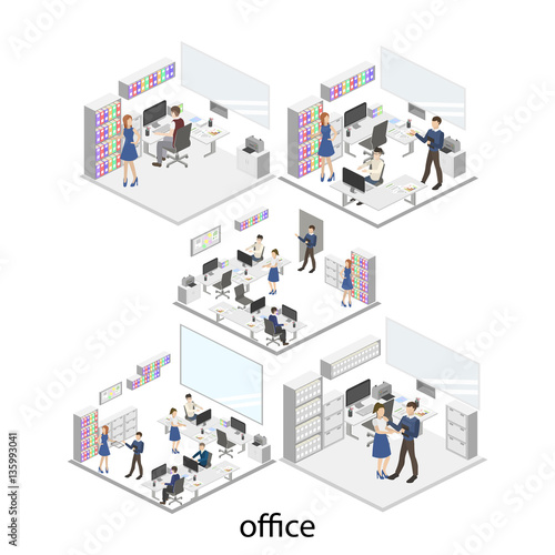 Connected to cloud storage business people work at office, at home and cafe, flat vector isometric illustration. Data storage, cloud computing technology. Remote work. Global outsourcing and teamwork.
