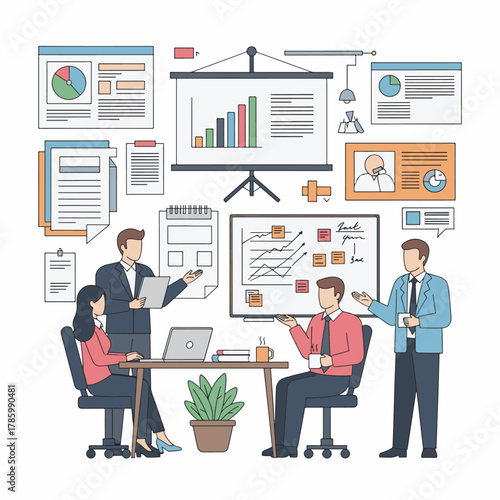 Construction engineer, architect giving presentation of architectural project of house building, flat vector illustration. Building industry. Construction team meeting.