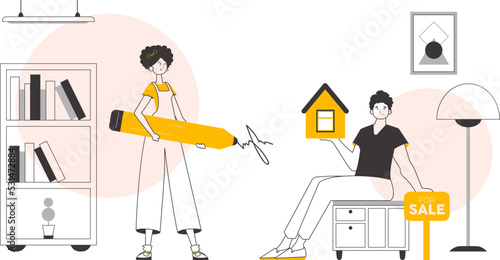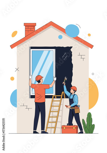 Man in helmet running with rolled up blueprints, woman drawing with pencil, city construction site with tower crane, vector illustration. Construction engineer services concept for website page etc.