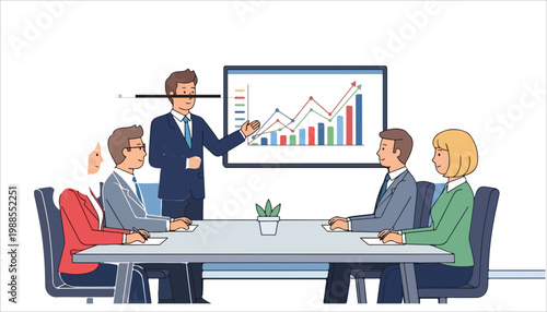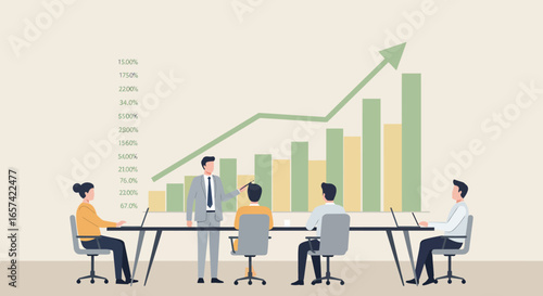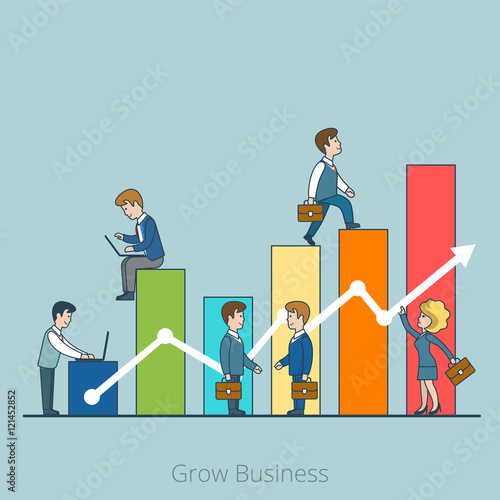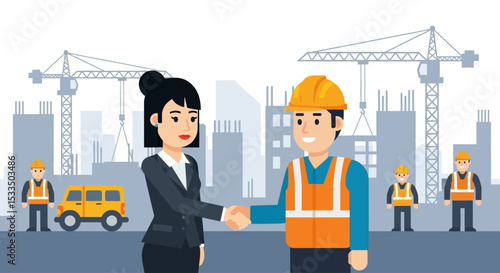 Construction workers standing on raising bar graph, flat vector illustration. Builder, architect, engineer, master, supervisor, foreman. Growth in construction industry. Home builder career path.
