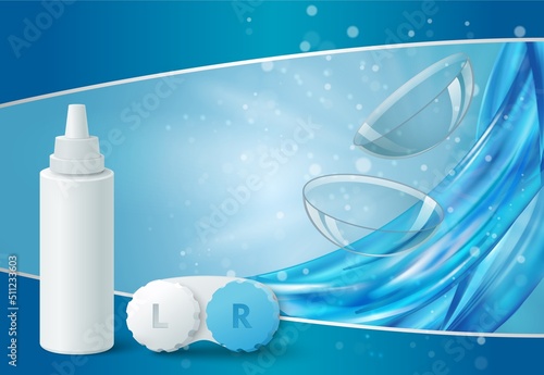 Contact lenses advertising poster. Realistic medical drop bottle and container for storage over water splash bubble design. Ophthalmology, medicine and vision correction concept