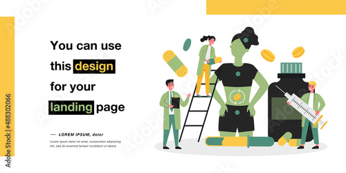 Content marketing team landing page website template. Vector flat illustration. Group of employees graphic designers, writers or video artists working at creation of content. Blog marketing.