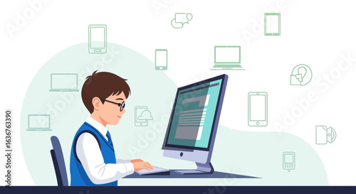 Cooking school blog vector. Man watching webinar masterclass lesson at home. New sweet cake recipe presentation. Woman chef baking dessert while streaming online video