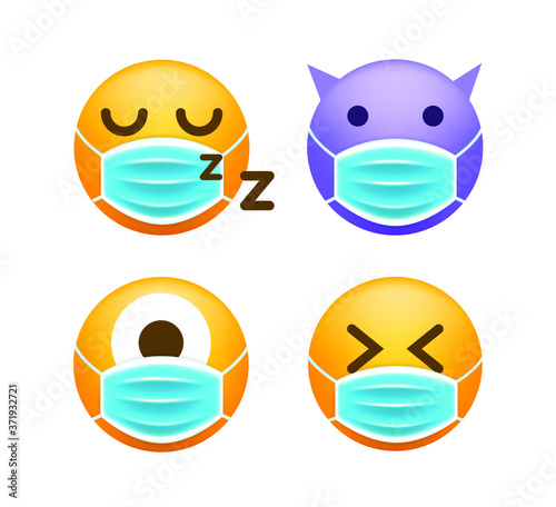 Face mask emoji set, vector isolated illustration. Yellow smile wearing medical mask for social media chat. Cute emoticon characters for electronic comunication. Corona virus disease COVID-19 concept