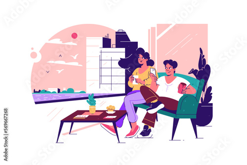 Coronavirus test lab, concept vector illustration. Scientists and doctors use microscope in laboratory. Covid vaccine research. Corona virus spike protein shape.