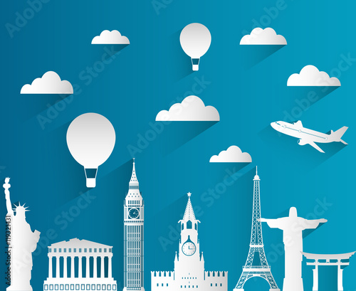 Covid-19 vaccine vials, injection syringe on display podium, world famous landmarks, vector illustration in paper art style. Coronavirus vaccination, immunization. Travel after covid vaccine.