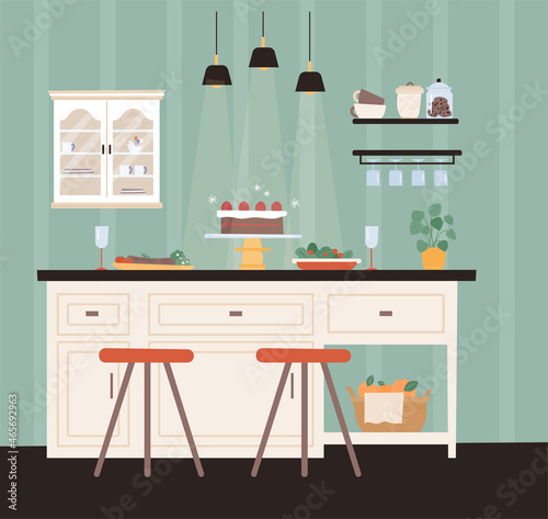 Cosmetics store. Female shop assistant standing at counter, flat vector illustration. Shelves with health and beauty products. Makeup, hair, face and body skincare cosmetics.