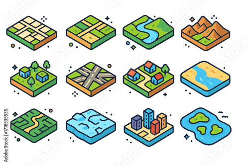 Cottage construction steps. Vector isometric illustration of site grading, plumbing and drainage, foundation setting, roofing, wrap installation, framing, cladding, windows and doors and ready house.
