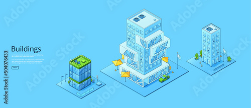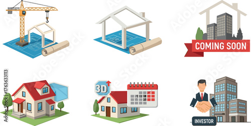 Cottage construction vector flat isometric poster, banner set. Foundation, Framing, Roofing, Windows and doors design elements.