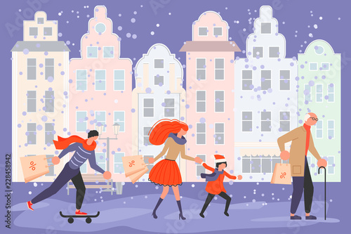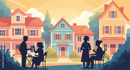 Couple choosing house to buy. Real estate concept vector illustration. Real estate agent offers property for sale. Broker helps people buying or renting house.