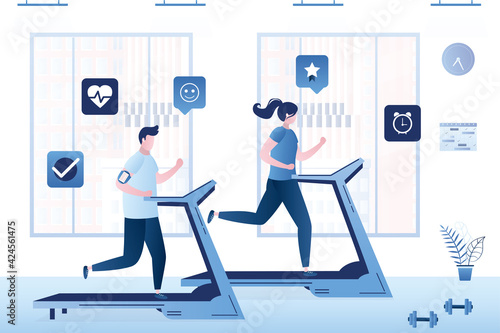 Couple running on treadmills, flat vector illustration. Fitness gym treadmill workout, healthy lifestyle, sport equipment.
