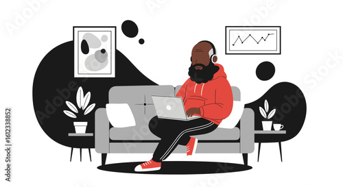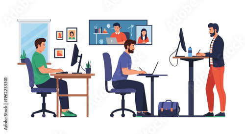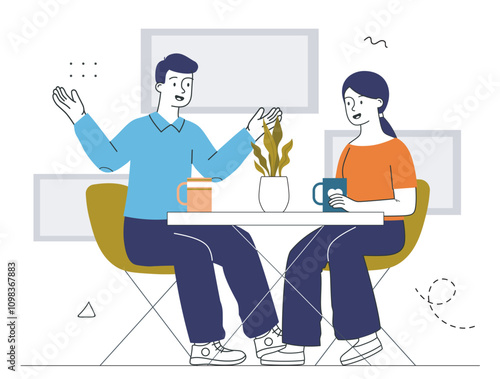Happy couple sitting at table with cups of coffee and mobile phones in hands, flat vector illustration. Cafe, restaurant interior. Young people lifestyles. Social media and smart phone addiction.