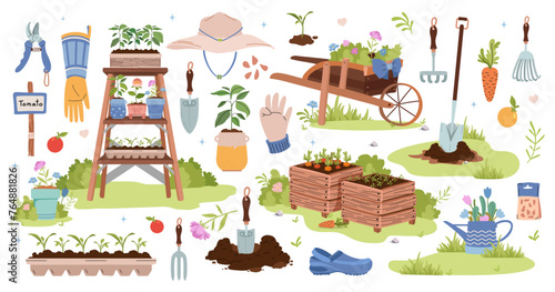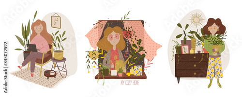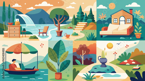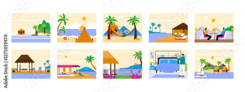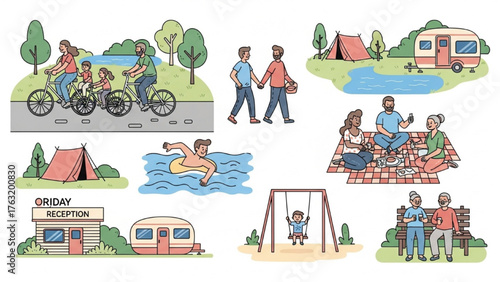 Couple sitting next to camp tent and watching starry night. Summer camp vacation vector posters set. Mountain and forest landscape with tents. Camping equipment. Adventure, nature, campfire.
