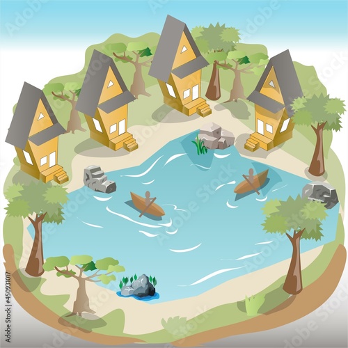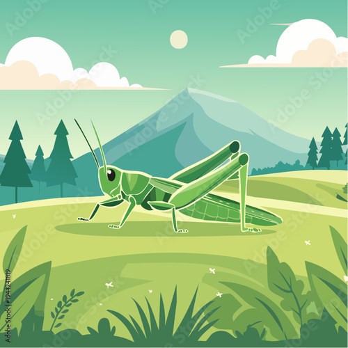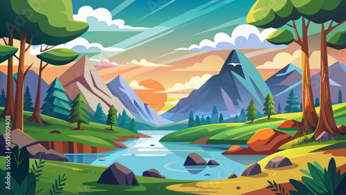 Couple trekking in mountains and crossing river. Travel adventure and hiking concept vector poster. Man and woman with backpack in outdoor nature landcape.